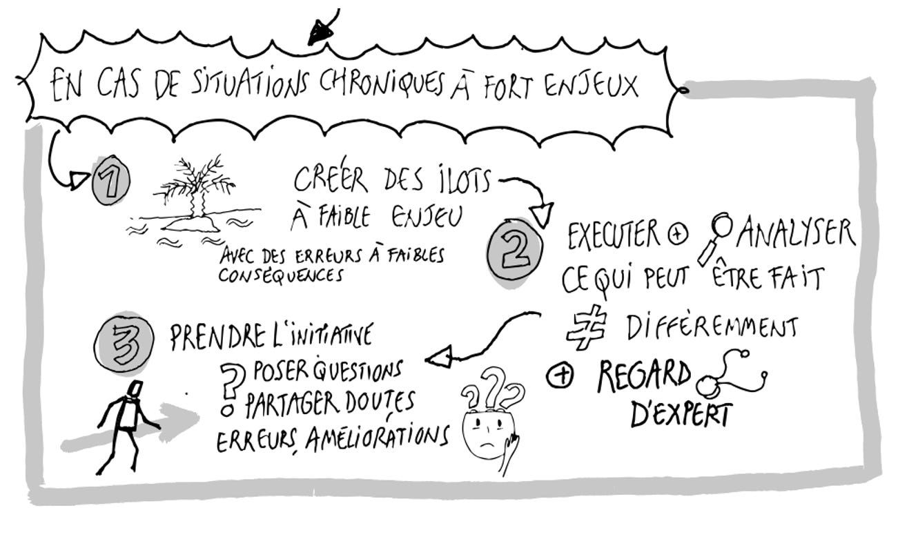 créer des “ îlots à faible enjeux” au sein de ces situations à fort enjeu, îlots dans lesquels on pourra par exemple aller chercher du feed-back, trouver un mentor, développer sa connaissance par des lectures et autres…